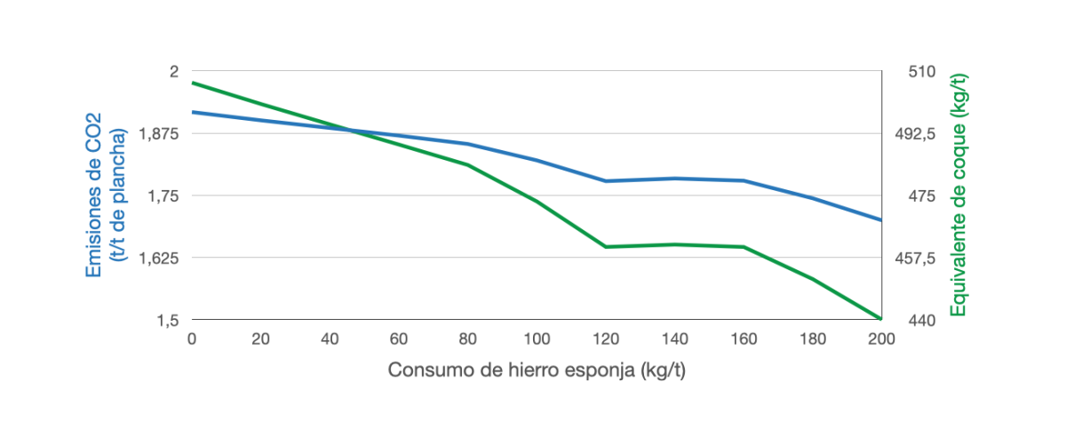 El consumo de 200 kilogramos de hierro esponja por tonelada de arrabio redujo la tasa de emisión del CO2 en 0,21 t CO2/t plancha (casi 11 %). Es de destacar que esta alternativa tiene limitaciones operacionales que, naturalmente, limitan el uso del hierro esponja.