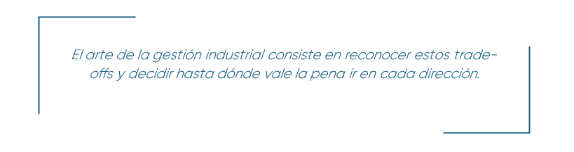 Muchas decisiones tácticas y estratégicas pueden traducirse en el triángulo ritmo de producción × calidad × costo. Los tres vértices están en tensión constante, y mover uno inevitablemente desequilibra los otros. El arte de la gestión industrial consiste en reconocer esos trade-offs y decidir hasta dónde vale la pena avanzar en cada dirección.