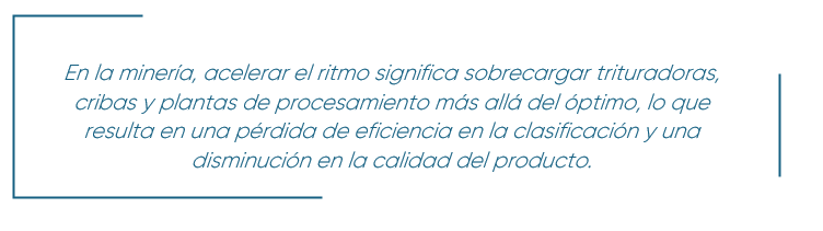 En minería, forzar el ritmo significa presionar trituradoras, cribas y plantas de beneficio más allá del punto óptimo, lo que provoca pérdida de eficiencia en la clasificación y caída en la calidad de los productos. Esto puede reducir el grado de Fe y generar productos fuera de especificación, disminuyendo la prima en el mercado.